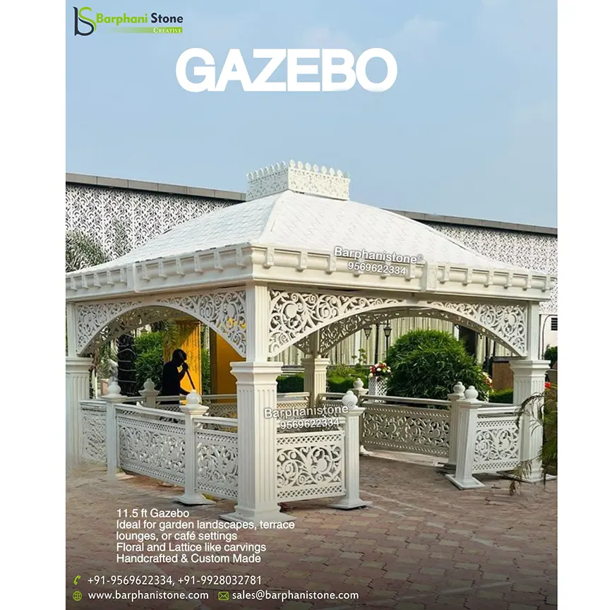 A gazebo, a freestanding architectural marvel. Finds its place in gardens, parks, and various outdoor settings. Characterized by an open design featuring a roof and columns or pillars supporting the structure. Gazebos provide a picturesque space for leisure and socializing. Among the diverse materials employed in gazebo construction. Sandstone stands out for its exceptional quality and weather-resistant properties. Crafted from high-quality sandstone, these gazebos boast durability that withstands the test of time and varying weather conditions.